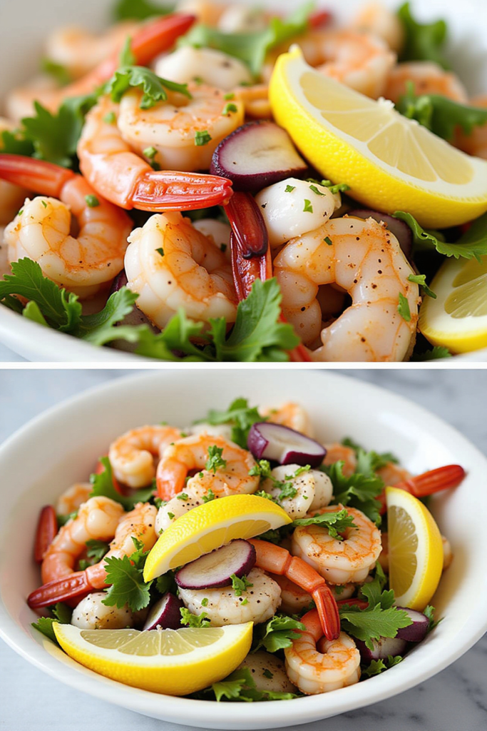 A simple vinaigrette of olive oil, fresh lemon juice, Dijon mustard, and a touch of honey enhances the natural sweetness of the seafood. Whisked until emulsified, this dressing brings out the freshness of the ingredients without overpowering their delicate flavors. A sprinkle of sea salt and cracked black pepper rounds out the taste profile for a salad that’s truly well-balanced.